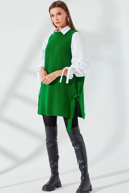 Трикотажный удлиненный жилет свободного силуэта. Горловина округлая. По бокам разрезы и декоративные завязки. (Блузу возможно приобрести отдельно номер мод. 3189) Рост 164-170 Длина жилета: 84см. Модель One Size.