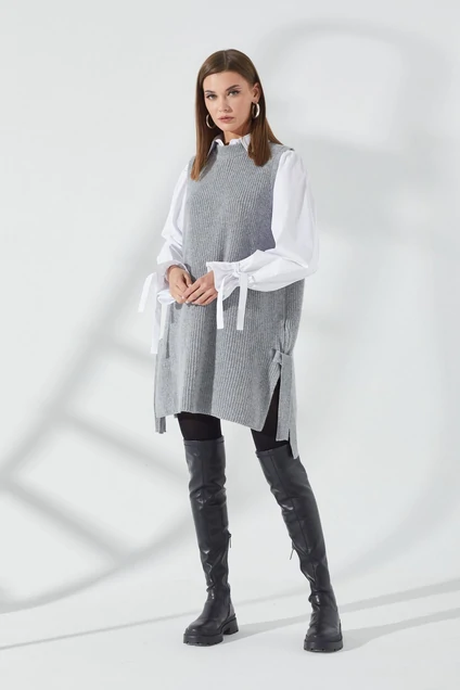 Трикотажный удлиненный жилет свободного силуэта. Горловина округлая. По бокам разрезы и декоративные завязки. (Блузу возможно приобрести отдельно номер мод. 3189) Рост 164-170 Длина жилета: 84см. Модель One Size.