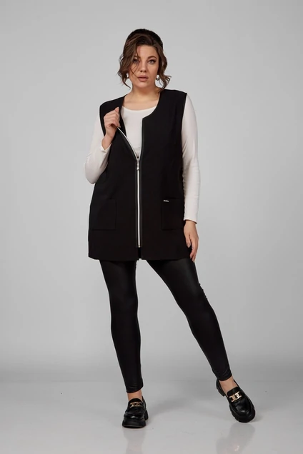 Жилет женский полуприлегающего силуэта, без рукавов. Проймы окантованы косой бейкой. Перед с нагрудными вытачками, выходящими из бокового шва, и накладными функциональными карманами. Горловина округлой формы, окантована косой бейкой. Застежка центральная, на «молнии». Спинка со средним швом. По низу боковых швов обработаны разрезы.