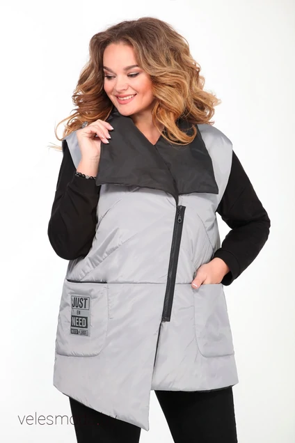 Жилет женский прямого силуэта,на синтепоне. Застежка ассиметричная на молнию. Воротник апаш. Перед отрезной по линии талии с карманами в шве. Полочка и спинка простеганы в верхней части. Линия низа переда ассимметрична. Жилет на тонкой подкладке. Длина по спинке 75,5 см.