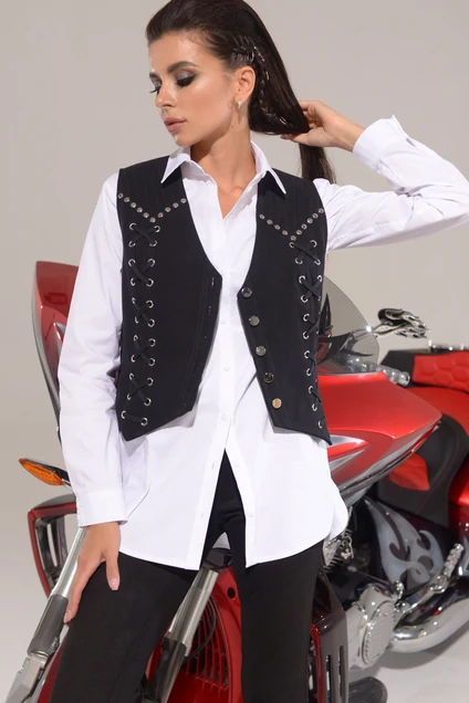 Жилет полуприлегающего силуэта V-образным вырезом горловины по переду и центральной застежкой на петли и пуговицы. Кокетки фигурные по переду и спинке, отстрочены декоративными строчками. рельефы с центральной вставкой на люверсах и шнуровке. Боковые — на функциональной действующей шнуровке. Низ изделия на обтачке, по переду фигурный!