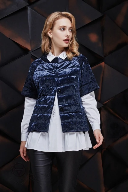 Куртка стеганая из велюра на сентипоне и подкладке с отрезным бочком, с центральной бортовой застежкой на пришивные кнопки. Перед с карманами в швах соединения с бочком. Рукав короткий реглан. Вырез горловины круглый. Воротник стойка. Длина по спинке – 53. Длина рукава – 18.