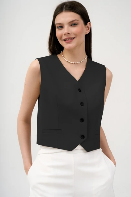 Жилет женский с V-образным вырезом и фигурным низом, приталенного силуэта.