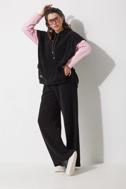 Жилет свободного силуэта. Выполнен из трикотажного вельвета. Вырез горловины овальной формы с капюшоном и декоративным шнуром. Перед с накладным карманом кенгуру, подрезом и карманом в нем. По бокам изделия выполнены разрезы. Жилет идеально сочетается с тонкими лонгсливами.