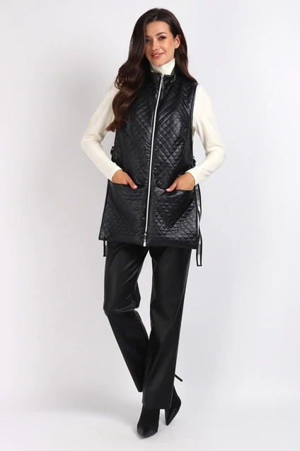 Жилет женский прямого силуэта изготовлен из эко-кожи с имитацией стёганой ткани.Застежка на декоративную молнию (длина молнии 73 см).По боковым швам отделочный элемент из декоративной тесьмы с застёжкой на пряжку, который можно регулировать на любой объём фигуры.На полочке функциональные карманы.Изделие на подкладке.Длина жилета 77 см. Подойдет на рост 164-170 см.Цвет основной ткани :чёрно-синий.