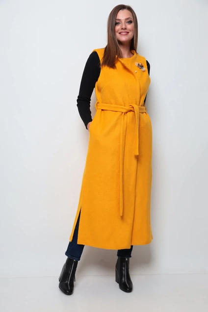 Длинный жилет «must have» в гардеробе этого сезона. Универсальное изделие подойдет к любому стилю одежды. Можно носить как поверх худи, так и классической рубашки, водолазки, как с кроссовками, так и на шпильке. Жилет выполнен из пальтовой ткани без подкладки, в боковых швах есть функциональные карманы, а низ дополняют разрезы. В комплект входит нарядная брошка и пояс из основной ткани. Длина изделия по спинке 127 (+/- 1 см).