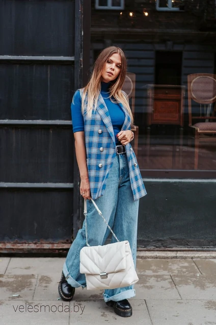 Жилет двубортный свободного кроя с шалевым воритником. На передних половинках прорезные карманы с листочкой . Жилет на подкладке, застёгивается на 2 петли - пуговицы.