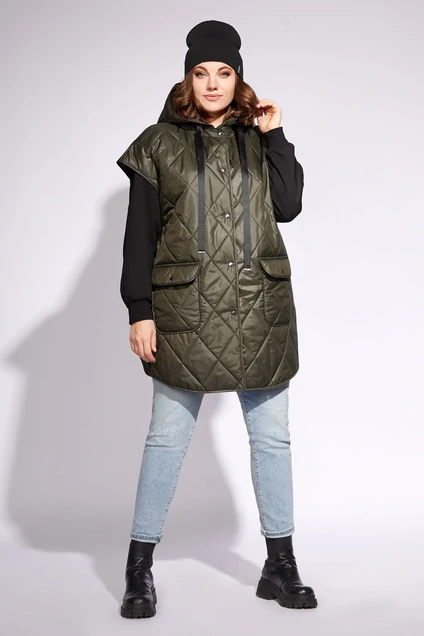 Жилетка женская свободного силуэта, по боковым швам-на кнопках. По переду-накладные карманы с клапанами. Горловина округлая, с отстёгивающимся капюшоном. Застёжка по переду на кнопки. Длина по спинке-83см