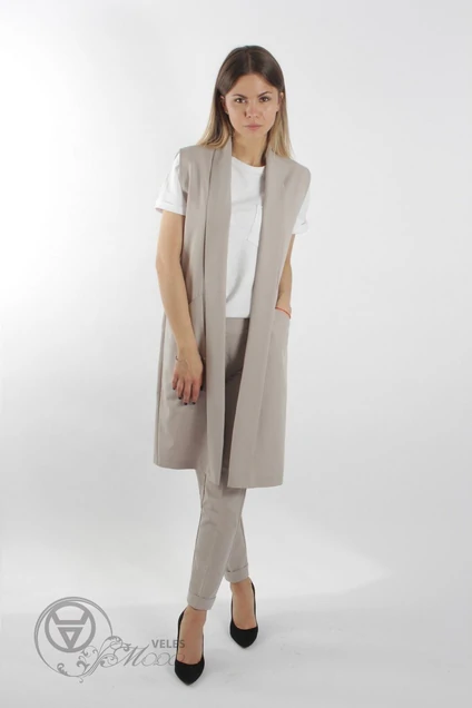 Жилет свободного прямого кроя с большими внутренними карманами по переду.Без застёжки. Ширина спины: 46р-48см 48р-50см 50р- 52см 52р- 54см 54р-56 см 56р-58см Длина 93- 98 см.