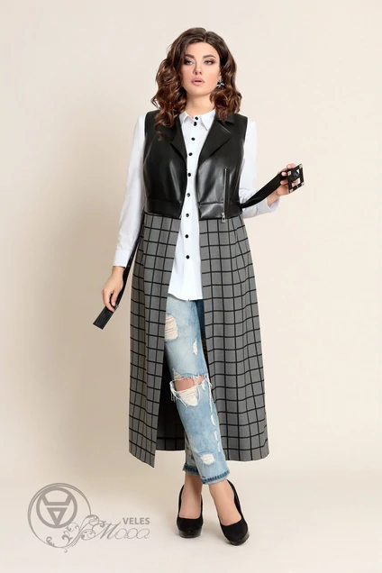 Жилет женский полуприлегающего силуэта, удлиненный. Выполнен из искусственной кожи (тянется) в сочетании с костюмной тканью в клетку (не тянется). Верхняя часть жилета (лиф) на подкладке. Декором служит металлическая молния и пояс из кожи с пряжкой. Длина жилета – 132 см.