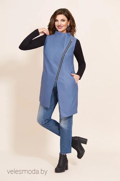 Жилет женский полуприлегающего силуэта на подкладке с ассиметричной застежкой молнией. Выполнен из искусственной кожи. По низу жилета обработаны прорезные карманы с листочкой. Вырез горловины – цельнокроенная стойка. Длина жилета – 86 см.