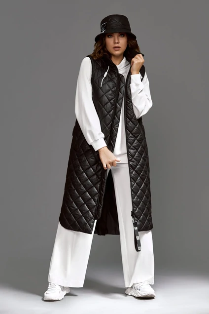 Жилет женский из стеганной ткани (не тянется) на подкладке прямого силуэта, удлиненный. Застежка центральная на молнию. Вырез горловины – воротник «стойка», на полочках обработаны прорезные карманы с клапаном. На спинке настрочена декоративная нашивка и вставлена молния (расстегивается как разрез). Длина жилета – 118 см.
