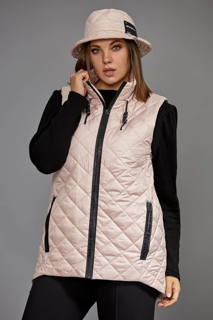 Жилет женский из стеганной ткани (не тянется) на подкладке прямого силуэта. Застежка центральная на молнию, вырез горловины – воротник «стойка». На полочках обработаны внутренние карманы с застежкой на молнию. Декором служит отделочный шнур по горловине. Длина жилета – 80 см.
