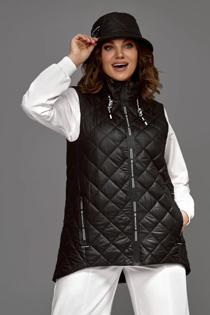 Жилет женский из стеганной ткани (не тянется) на подкладке прямого силуэта. Застежка центральная на молнию, вырез горловины – воротник «стойка». На полочках обработаны внутренние карманы с застежкой на молнию. Декором служит отделочный шнур по горловине. Длина жилета – 80 см.