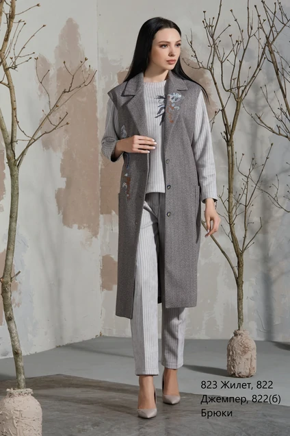 Удлиненный стильный жилет - универсальная вещь в гардеробе. Модель свободного прямого силуэта . Мягкая линия горловины со спущенной линией плеча , по переду выполнены накладные карманы. Полочка и лацкан декорированы дизайнерской вышивкой.