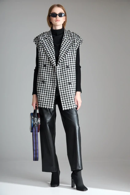 Удлиненный жилет из плотной текстильной ткани прямого силуэта. Жилет двубортный, полностью на подкладке. Воротник пиджачного типа. По воротнику, лацканам и по кокетке на спинке имеется отделочная бахрома. На плечевых швах имеются декоративные паты с пуговицей. В боковых швах имеются карманы. Длина жакета по центру спинки 78см.