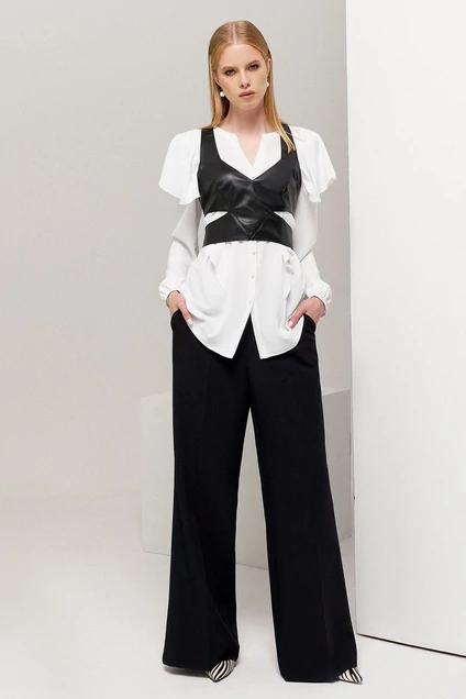 Короткий женский жилет – это стильный элемент одежды, который станет завершающим штрихом в деловом или повседневном образе. Оригинальный крой в виде топа на широких бретелях дополнен разрезами по бокам. Этот дизайнерский прием зрительно стройнит. Ткань, из готовой пошит трикотажный женский жилет, имеет характерный блеск. Поэтому жилет под кожу отлично смотрится с аналогичными брюками и различными кожаными аксессуарами. Его можно носить поверх блузы, рубашки, водолазки. Безрукавка красиво садится по фигуре, подчеркивает линию декольте. Вы можете заказать жилет женский, укороченный в размерах от 42 до 48 для офиса, встречи, учебы, вечеринки.