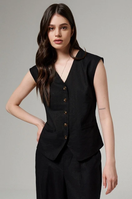 Жилет женский полуприлегающего силуэта из льняной ткани для повседневной носки. Жилет однобортный застегивающийся на пуговицы. По переду нагрудные вытачки и прорезные карманы" в рамку". По спинке пояс для регулировки посадки. Длина изделия классическая.