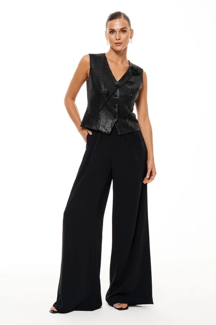 Женский жилет классического кроя из ткани в матовые пайетки — стильный и изысканный элемент гардероба, который привлечет внимание своей утонченностью.