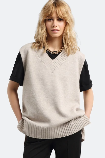 Комплект-двойка из вязаного жилета и хлопковой базовой футболки. Детали: жилет прямого силуэта, спущенная линия плеча, V-образный вырез горловины переда, перед и спинка разной длины с небольшими разрезами по бокам. Футболка свободного покроя со спущенной линией плеча, прямой силуэт, круглая горловина, рукава втачные короткие