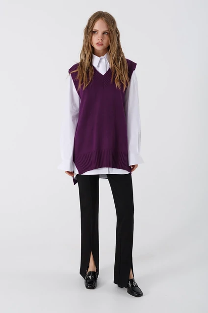 Комплект-двойка из вязаного жилета и хлопковой свободной рубашки. Детали: жилет прямого силуэта, спущенная линия плеча, V-образный вырез горловины переда, перед и спинка разной длины с небольшими разрезами по бокам. Рубашка прямого силуэта со спущенной линией плеча, рубашечный воротник, потайная застежка на петли и пуговицы, кокетка переда и спинки, рукава длинные с манжетами