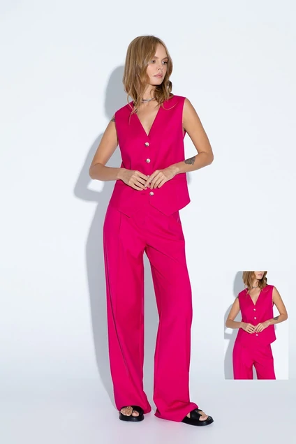 Классический жилет из текстильной ткани. Детали: жилет полуприлегающего силуэта с фигурным низом, застежка на петли и пуговицы, на подкладке