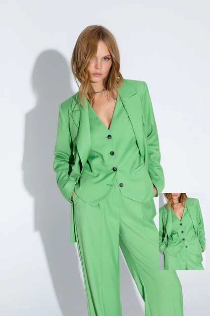 Классический жилет из текстильной ткани. Детали: жилет полуприлегающего силуэта с фигурным низом, застежка на петли и пуговицы, на подкладке