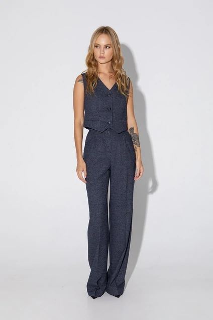 Укороченный жилет из костюмной ткани в мелкую клетку. Детали: жилет прямого силуэта с фигурным низом, талиевые вытачки, застежка на петли и пуговицы, функциональные карманы, на подкладке.