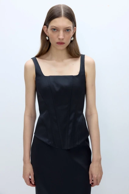 Атласный корсет с глубоким квадратным вырезом.