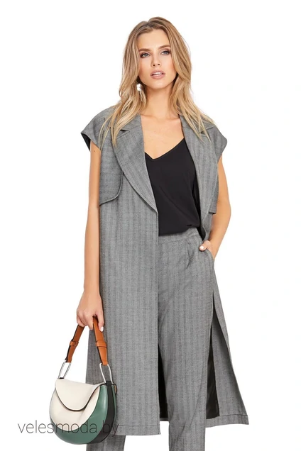 Универсальный двубортный жилет без застежки, с отлетными кокетками и съемным поясом. Детали: прямой силуэт, спущенная линия плеча, пиджачный воротник, большие отлетные кокетки переда и спинки, карманы в боковых швах, шлевки, на подкладке
