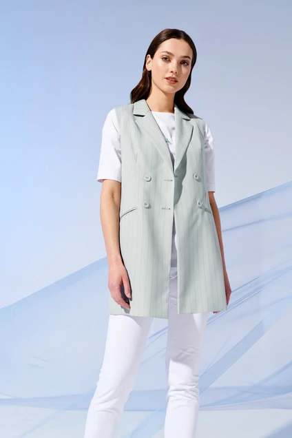 Удинненный двубортный жилет с застежкой на пуговицы, в комплекте пояс.