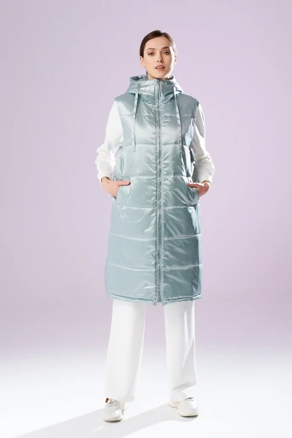 Женская удлиненная жилетка, выполненная из плащевой ткани и утепленная наполнителем isosoft. Изделие на подкладке.