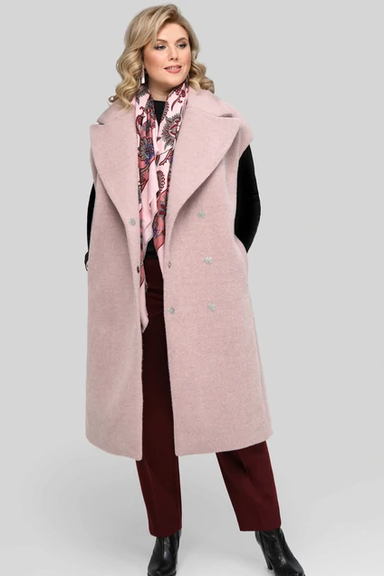 Женская жилетка прямого силуэта. Выполненная из пальтовой ткани. Застежка центральная двубортная на потайные кнопки. Воротник пиджачного типа с лацканами. Рукав втачной со спущенной линией плеча. По переду есть рельефные швы, в которых располагаются карманы с листочкой. Спинка со средним швом, по низу шва – шлица. Изделие на подкладке. Есть съемный мягко завязывающийся пояс. Длина изделия по спинке 112 см.