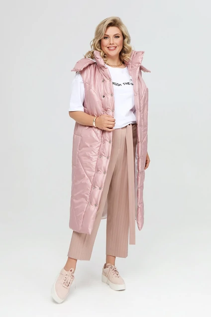 Удлиненная женская жилетка прямого силуэта, выполненная из плащевой ткани на тонком синтепоне. Изделие на подкладке. Детали переда имеют широкую наклонную стежку, спинка и бочки имеют широкую горизонтальную стежку. По переду есть смещенные рельефные швы, в которых располагаются карманы. Застежка на широкую планку с двойным рядом пробивных кнопок. Воротник – высокая стойка. Есть съемный капюшон. Длина изделия по спинке от шва втачивания воротника в горловину 114 см.
