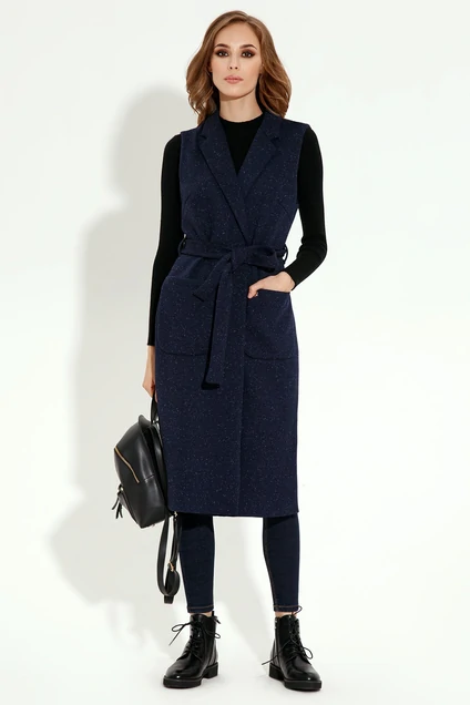 Стильный удлиненный жилет из полушерстяной ткани. Жилет без застежки на запах со съёмным поясом из основной ткани. Жилет длиной ниже коленей, по бокам разрезы, по переду большие накладные карманы. Жилет имеет V-образный вырез горловины с воротником и лацканами. Стильный модный жилет отлично сочетается как с классическими брюками, создавая строгий офисный стиль, так и отлично сочетается с любимыми джинсами и кроссовками в стиле кэжуал.