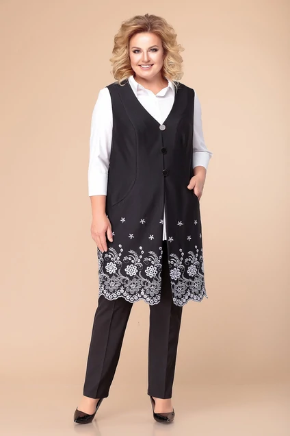 Жилет женский прямого силуэта, длиной до колена. Жилет предназначен для повседневной носки. Перед с 2-мя отрезными бочками, в швах соединения их с передом обработаны карманы. Спинка с 2-мя таллиевыми вытачками. Горловина с V- образным вырезом, обтачная без воротника. Застежка центральная, бортовая на 2-е навесные петли и 2-пришивные пуговицы. Проймы обтачные. Жилет выполнен из трикотажного полотна с вышивкой.Длина спинки 92 см