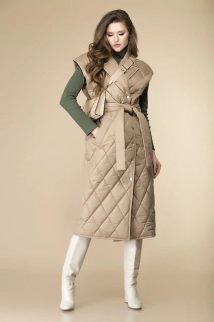 Жилет женский прямого силуэта, длиной до середины икры предназначен для повседневной носки. Перед с двумя прорезными карманами с листочками с втачными концами. Спинка цельнокроенная. Горловина с воротником пиджачного типа, с отложным лацканом. Застежка центральная, бортовая, на 6 пробивных металлических кнопок. Жилет на подкладке. Жилет с поясом. Длина спинки 119см.