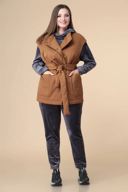 Жилет полуприлегающего силуэта, длиной ниже линии бедер. Перед с двумя нагрудными вытачками, с двумя отрезными бочками, с двумя накладными карманами на уровне линии бедер. Спинка с двумя отрезными бочками. Горловина круглая с втачной стойкой, застежка бортовая ассиметричная на 7 пробивных металлических кнопок. Плечо слегка спущено. Проймы обтачные. Жилет на подкладке. Жилет со съемным поясом, фиксирующимся через две шлевки, закрепленные в боковых швах.