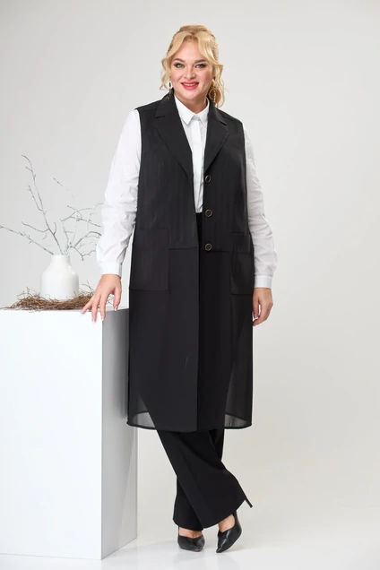 Жилет женский предназначен для повседневной носки. Жилет прямого силуэта, отрезной ниже линии талии на 10 см. Верхняя часть переда с 2-мя отрезными рельефами, выходящими из пройм. Нижняя часть переда из отделочной ткани (шифон). Перед с 2-мя прямоугольными накладными карманами на уровне линии бёдер. Верхняя часть спинки с фигурной отрезной кокеткой, со средним швом и 2-мя отрезными бочками. Нижняя часть спинки из отделочной ткани (шифон). Горловина с v-образным вырезом с втачным воротником пиджачного типа с отложным лацканом. Застёжка центральная бортовая на 3-и обмётанные петли и 3-и пришивные пуговицы. Проймы обточные. Верхняя часть жилета на подкладке.