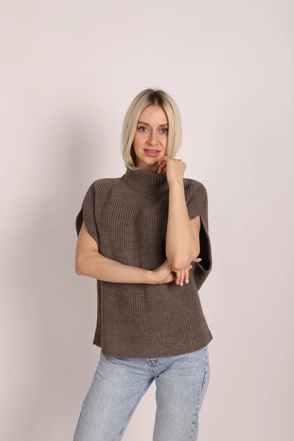 Мягкий, объёмный жилет прямого силуэта, связан из полушерстяной  пряжи.  Линия плеча занижена, горловина круглая, обработана прикеттлеваным воротником стойкой. Жилет связан объёмным рельефным переплетением " полу фанг".  Длина жилета 57см. Сочетается с юбкой плиссе, брюками и  джинсами.