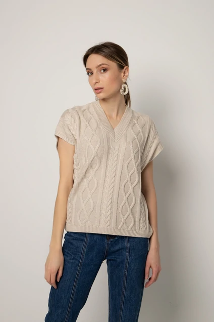Модный трендовый жилет прямого силуэта, связан из полушерстяной пряжи. Перед жилета вывязан рельефным переплетением "косы и ораны", спинка - кулирной гладью. Горловина V- образная обработана накеттлёваной бейкой. По низу изделия ластик. Длина жилета 58см. Можно носить вечером как модный тренд на голое тело, а также в офис на белую объёмную рубашку.