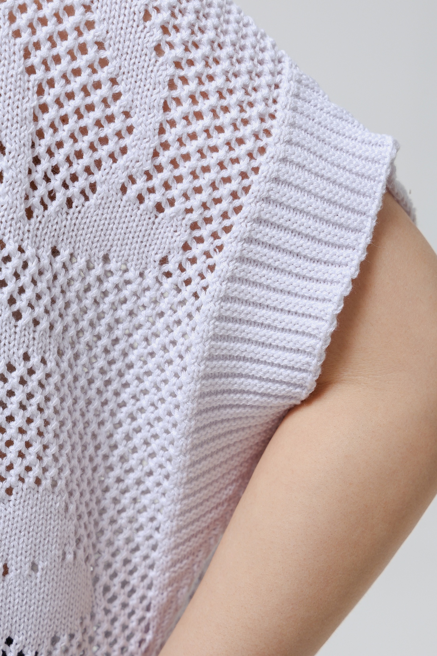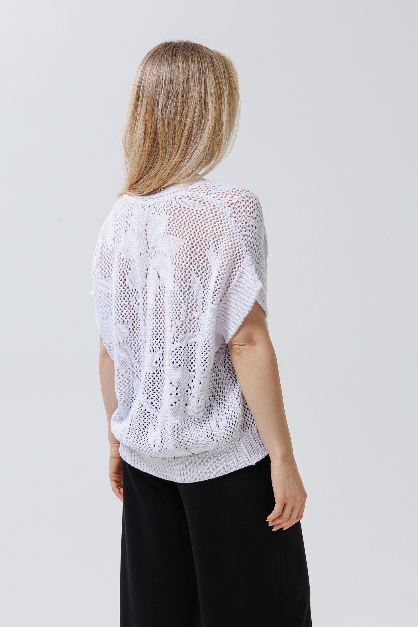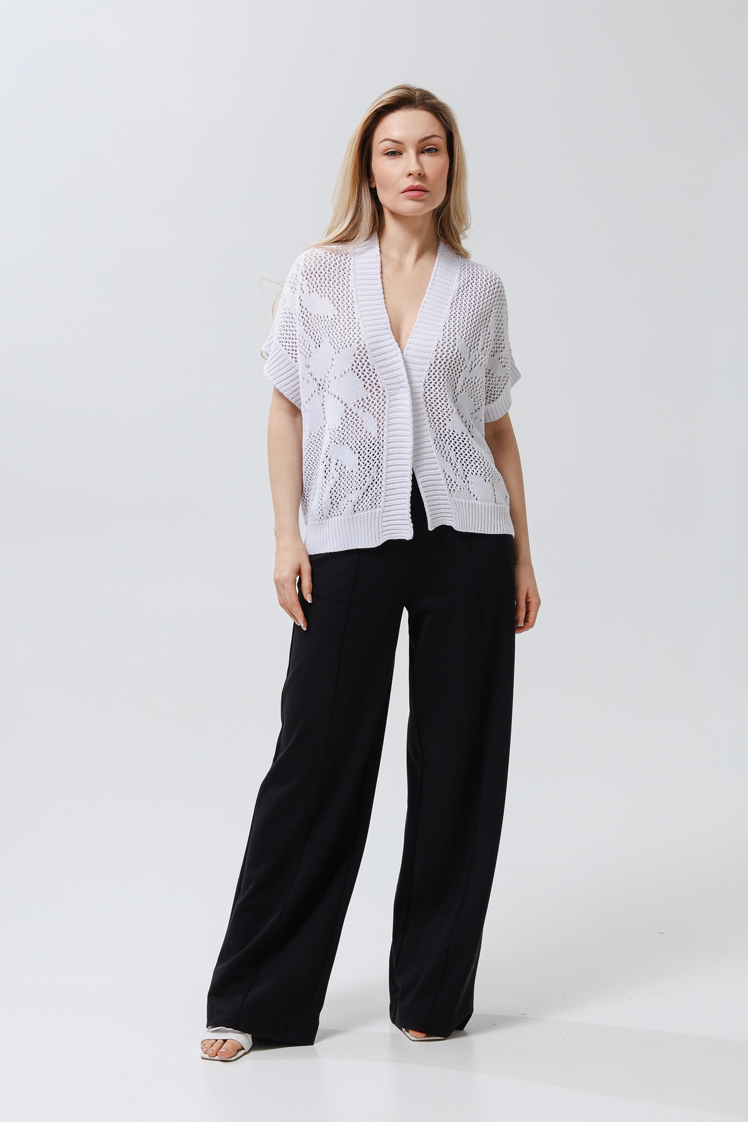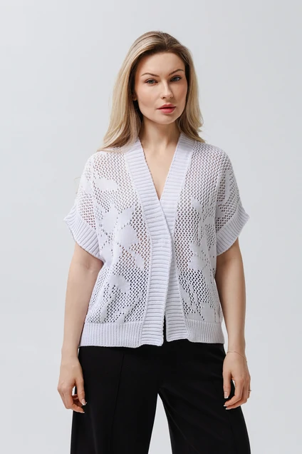 Жилет РВ0394-ХЛ4 белый Romgil добавит свежести и универсальности вашему гардеробу. Коллекция бренда Romgil характеризуется использованием лёгкой ажурной ткани, которая обеспечивает комфорт в тёплое время года. Дизайн с короткими рукавами и V-образным вырезом делает жилет подходящим для повседневной носки и вечерних мероприятий. Белый цвет и оригинальный ажурный узор подчеркнут женственность и стиль. Идеально сочетается как с брюками, так и с юбкой, что позволяет создавать разнообразные образы. Надевайте с бижутерией для эффектного выхода или с кроссовками для удобного повседневного стиля. Жилет отлично подходит для весенне-летнего сезона.
