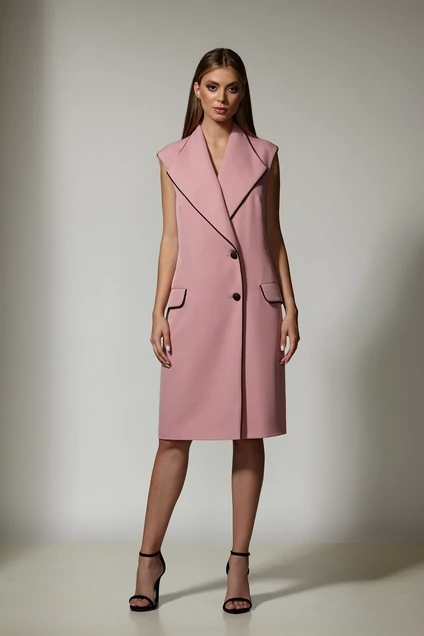Двубортный жилет из костюмной ткани на подкладке. Перед с нагрудными вытачками, прорезными карманами с клапанами. Спинка с рельефами и хлястиком по линии талии. Воротник-апаш. По воротнику, бортам и клапанам - отделочный кант. Жилет застегивается на 2 основные пуговицы и 1 потайную. Жилет может прекрасно дополнить водолазка. Цвет - розовый.