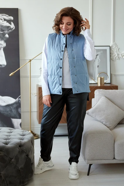Горловина жилета оформлена воротником -стойкой. Жилет застегивается на кнопки.