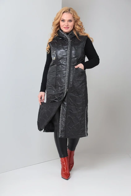 Женская удлиненная жилетка, выполненная из курточной тесненной ткани и утепленная синтепоном. Изделие на подкладке. Застежка смещенная на молнию. По переду нагрудные вытачки и накладные фигурные карманы. Спинка с вытачками. В боковых швах разрезы (30 см). Декором служит отделочная тесьма вдоль молнии, капюшона, разрезов и по краям карманов. А также жилет задекорирован дизайнерской вышивкой. Данная модель прекрасно сочетается практически с любой одеждой и обувью, подходит для осени и ранней весны. Длина жилетки по спинке от шва втачивания капюшона 109 см.