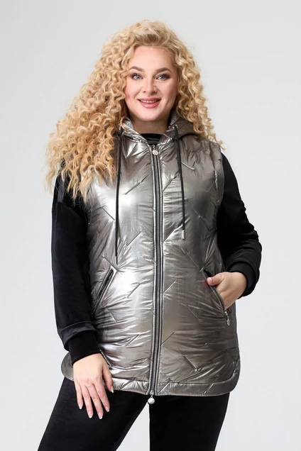 Жилет женский прямого силуэта из стеганой плащевки на синтепоне, с мехом на изнанке. Искусственный мех мягкий приятный на ощупь. Ткань легкая воздушная хорошо держит форму. По горловине капюшон. По переду прорезные карманы на молнии. Застежка на молнию. В боковых швах фигурные разрезы.