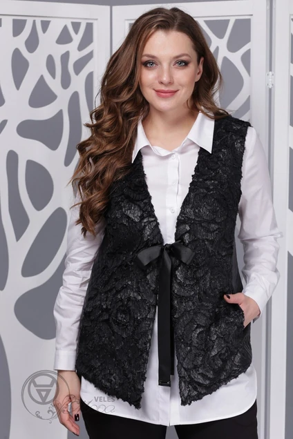 Жилет женский из искусственного меха, с покрытием, полуприлегающего силуэта до линии бедер, застежка на репсовые ленты, протянутые через люверсы.