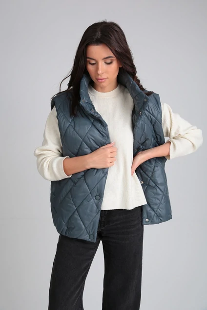Жилет из стеганной плащевки на подкладке, прямого силуэта, слегка присборен по низу, с центральной бортовой застежкой на кнопки. На переде расположены карманы с листочкой. Воротник стойка с застежкой на кнопки.
