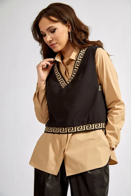 Жилет свободного силуэта. Горловина V-образная, по переду обработаны нагрудные вытачки, довяз по пройме, по горловине, по низу изделия. На спинке вытачки и средний шов.