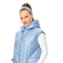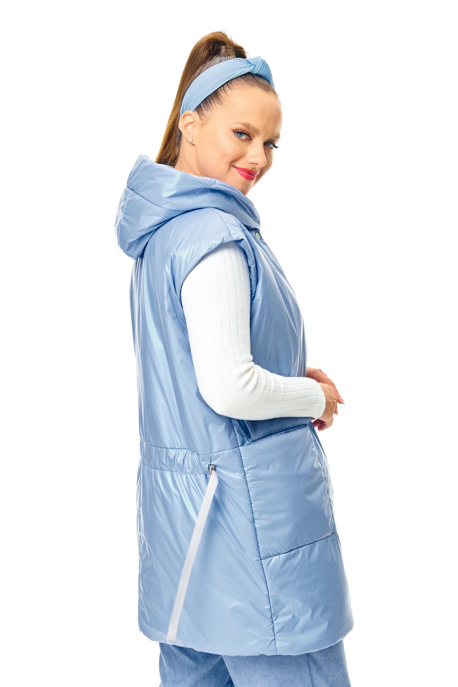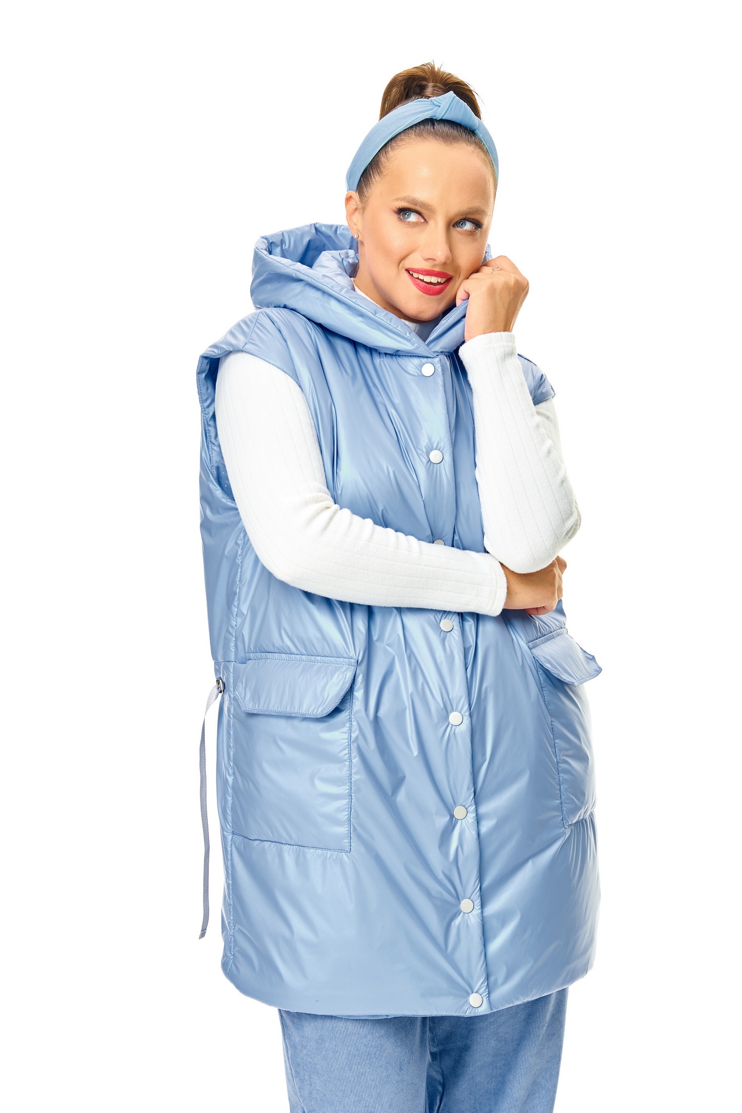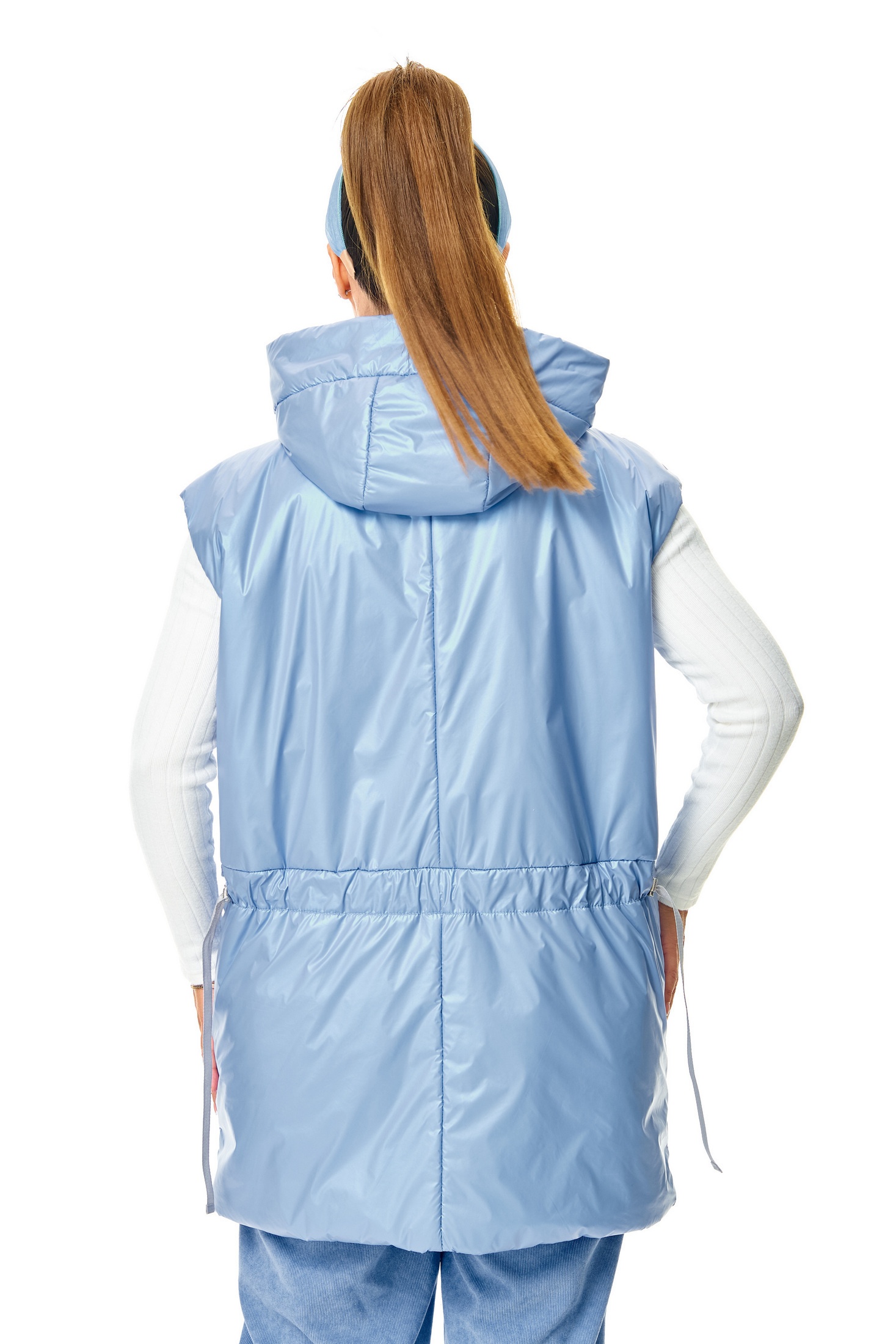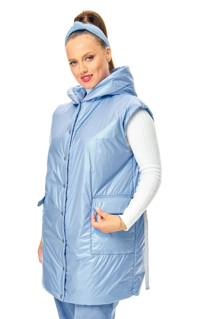 Удлиненный жилет с глубоким капюшоном на легком утеплителе синтепон. Застежка на кнопки. По переду накладные карманы с клапаном. Низ затягивается на кулиску. Жилет на подкладке. Длина размер 52-54 78 см. Окружность по груди размер 44-46 116 см ,48-50 120 см, 52-54 124 см